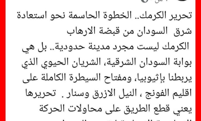 ■ بعد 39 عامًا من زيارة مولانا الميرغني لجلب سلاح من العراق لتحرير الكرمك، يأتي الشاب إبراهيم الميرغني، والذي يُعرّف بزوج تسابيح أكثر من تعريفه بأي صفة سياسية، ليتقيأ على تاريخ الاتحاديين بكلماته الساقطة التي سطرها اليوم مرحبًا فيها بما أسماه تحرير مدينة الكرمك على أيدي الجيش الإثيوبي!!