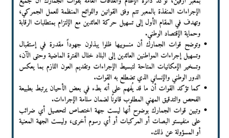 ونفت قوات الجمارك بشكل قاطع اختصاصها بتحصيل أي ضرائب على منفستو البصات أو المركبات أو أي رسوم أخرى، مؤكدة أنها ليست الجهة المعنية أو المسؤولة عن ذلك.