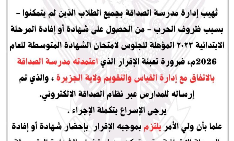 تُهيب إدارة مدرسة الصداقة بجميع الطلاب الذين لم يتمكنوا – بسبب ظروف الحرب – من الحصول على شهادة أو إفادة المرحلة الابتدائية ٢٠٢٣ المؤهلة للجلوس لامتحان الشهادة المتوسطة للعام 2026م، ضرورة تعبئة الإقرار الذي اعتمدته مدرسة الصداقة بالاتفاق مع إدارة القياس والتقويم ولاية الجزيرة ، والذي تم إرساله للمدارس عبر نظام الصداقة الالكتروني.
