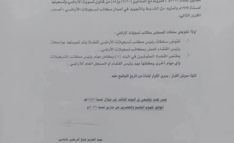 وبحسب القرار، الذي استند إلى أحكام قانون السلطة القضائية وتعديلاته، تم منح القضاة المختصين صلاحيات مباشرة للعمل بمكاتب تسجيلات الأراضي، بما يشمل تنفيذ الإجراءات القانونية المرتبطة بالتسجيلات، إلى جانب أي مهام أخرى يُكلفون بها من قبل الجهات المختصة.