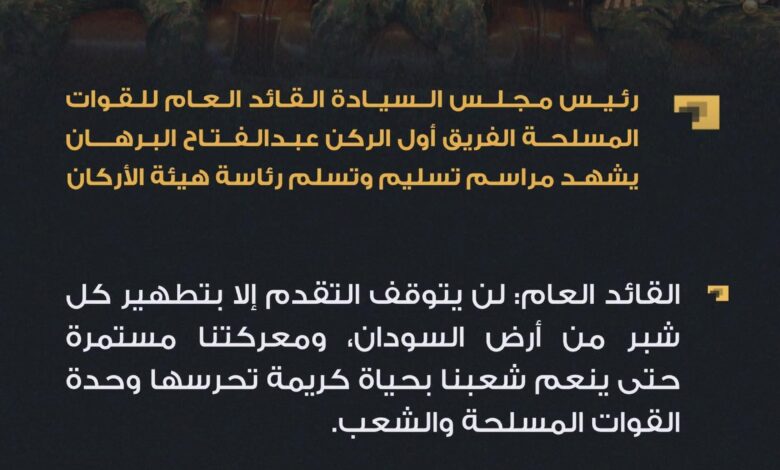 وقال القائد العام ”لن يتوقف التقدم إلا بتطهير كل شبر من أرض السودان، ومعركتنا مستمرة حتى ينعم شعبنا بحياة كريمة تحرسها وحدة القوات المسلحة والشعب.”