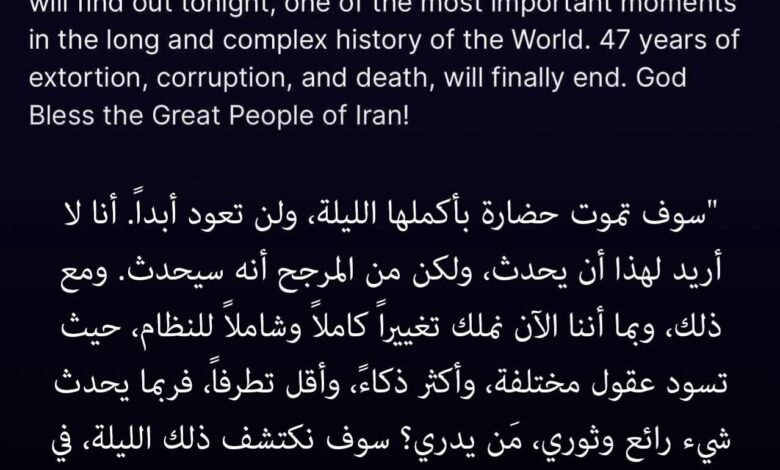 وتابع قائلاً إن الساعات المقبلة قد تحمل واحدة من أهم اللحظات في تاريخ العالم، متوقعًا نهاية ما وصفه بـ”عقود من الفساد والصراع”، مختتمًا تصريحه برسالة دعم للشعب الإيراني.