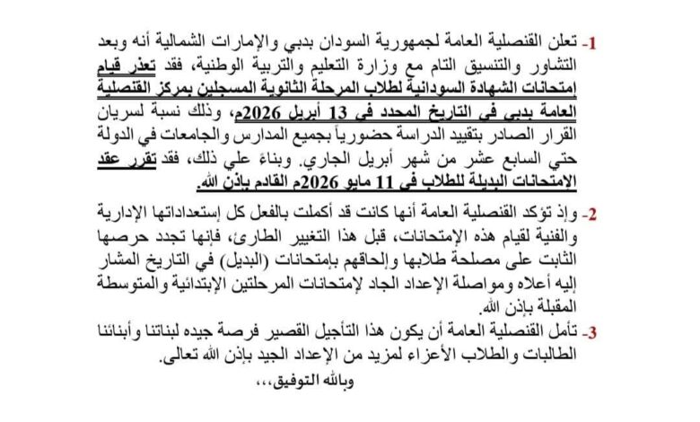 أعلنت القنصلية العامة لجمهورية السودان بدبي والإمارات الشمالية عن تأجيل انعقاد امتحانات الشهادة السودانية للعام 2025، التي كان مقرراً لها يوم 13 أبريل 2026، وذلك عقب التنسيق مع وزارة التربية والتعليم.