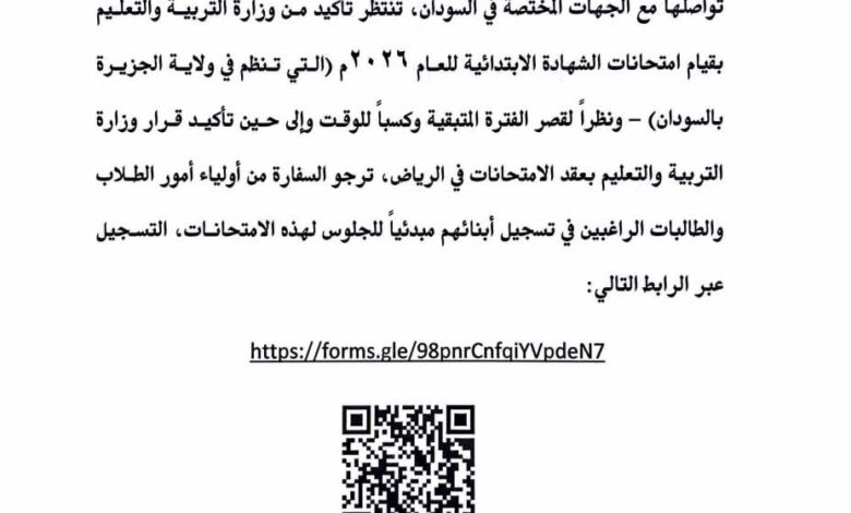 وأوضحت السفارة أنها لا تزال في انتظار تأكيد رسمي من وزارة التربية والتعليم السودانية بشأن قيام الامتحانات، التي تُنظم بولاية الجزيرة، مشيرة إلى أن خطوة التسجيل تأتي كإجراء استباقي نظرًا لضيق الزمن المتبقي.