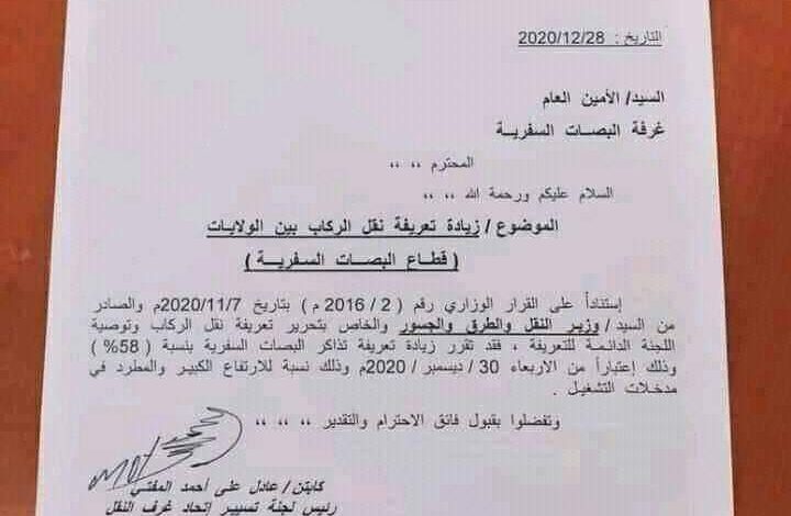 تبراءت وزارة البنى التحتية والنقل من الخطاب الصادر من لجنة تسيير اتحاد غرف النقل السوداني والذي تناول زيادة تعرفة نقل الركاب بين الولايات (قطاع البصات السفريه) مستندآ على القرار رقم (٢)لسنة ٢٠١٦م لوزير النقل والطرق والجسور الخاص بتحرير تعرفة نقل الركاب .