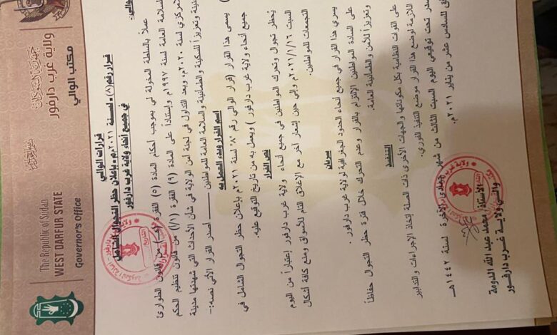 اصدر والي ولاية غرب دارفور محمد عبد الله الدومة يوم السبت قرارا بحظر التجوال في جميع انحاء الولاية في اعقاب الاحداث التى وقعت في حاضرة الولاية مدينة الجنية.