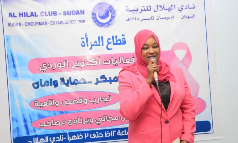 نظم قطاع المرأة بنادي الهلال مساء السبت بدار النادي، فعاليات الإحتفال بأكتوبر الوردي ، شهر التوعية بسرطان الثدي، حيث شمل البرنامج محاضرات توعوية ، واحتفالية ترفيهية.