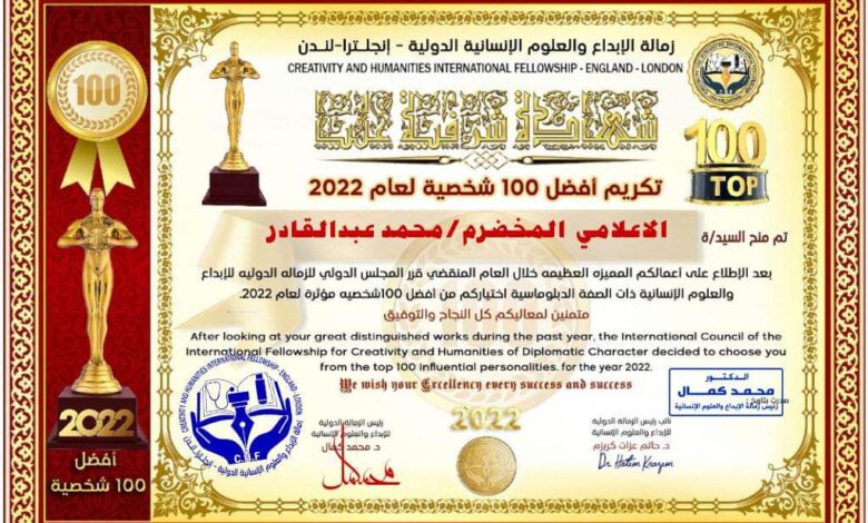 كرمت (زمالة الابداع والعلوم الانسانية الدولية)- ومقرها لندن- الاعلامي السوداني محمد عبدالقادر ضمن افضل 100 شخصية خلال العام 2022م.