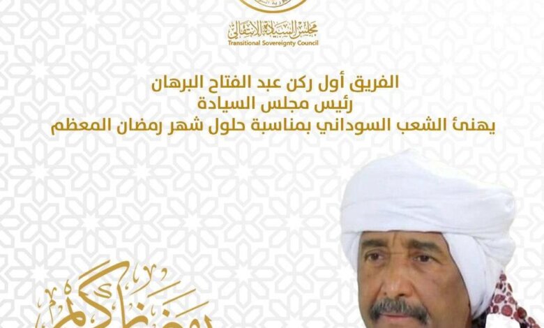 هنأ السيد رئيس مجلس السيادة الانتقالي القائد العام للقوات المسلحة *الفريق أول ركن عبد الفتاح البرهان* عموم الشعب السوداني وأفراد القوات المسلحة والقوات النظامية الأخرى المنتشرون على كافة أنحاء البلاد بحلول شهر رمضان الفضيل، متضرعا للمولى -عز وجل- أن يجعل مقدمه الميمون رحمة وبركة وخيرا على بلادنا وشعبنا وقواته المسلحة، وأن يتقبل شهداءنا ويشفي جرحانا، وأن ينعم الوطن بالأمن والاستقرار.
