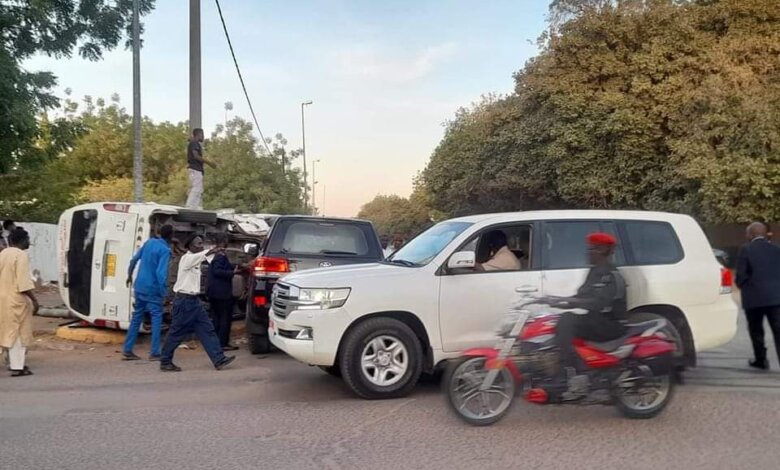 تعرض السفير الأمريكي قود فري لحادث حركة بالخرطوم، ويبدو من الصورة ان عربته اصطدمت بعربة إسعاف ما ادى لانقلابها.
