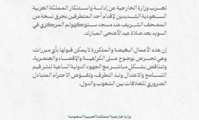 الخارجية السعودية: بيان استنكار وإدانة لحرق مصحف بالسويد