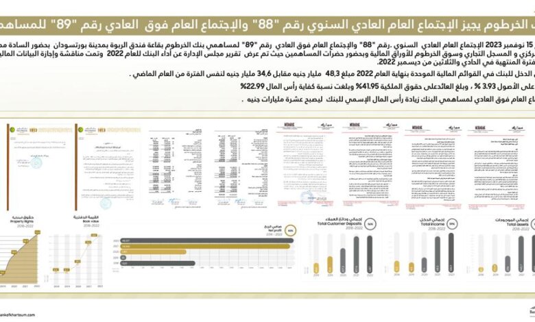 عقد بنك الخرطوم الاجتماع العام العادي السنوي رقم “88”،والاجتماع العام فوق العادي رقم ” 89″ لمساهمي بنك الخرطوم بقاعة فندق الربوة ببورتسودان بتاريخ 15 نوفمبر 2023م وذلك بحضور السادة ممثلي بنك السودان المركزي والمسجل التجاري وسوق الخرطوم للأوراق المالية وبحضور المساهمين حيث تم عرض تقرير مجلس الادارة عن أداء البنك للعام 2020م .وقد تمت مناقشة وإجازة البيانات المالية الخاصة بالبنك عن الفترة المنتهية في الحادي والثلاثين من ديسمبر 2022م .