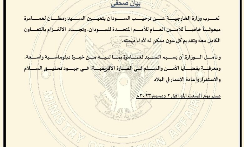 السودان يرحب بالمبعوث الخاص للأمين العام للأمم المتحدة ويعلن عن تعاونه معه وتقديم العون