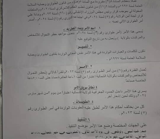 الأمر تعدل الفقرة رقم (1) من أمر الطوارى رقم (٥) لسنة ٢٠٢٣م للقرا كالآتي يحظر التحوال