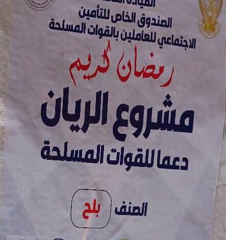 كشفت الأمانة العامة للصندوق الخاص للتأمين الاجتماعي للعاملين بالقوات المسلحة وشركائه عن انطلاق مشروع الريان دعما للقوات الشعب المسلحة بتكلفة تبلغ اكثر من مليار جنية سوداني بمناسبة حلول شهر رمضان المعظم واشادت الامان على الدور الكبير للقائد العام للقوات المسلحة ورعايته للمشروع بجانب الاشراف الكامل من قبل رئيس هيئة الاركان ونوابه