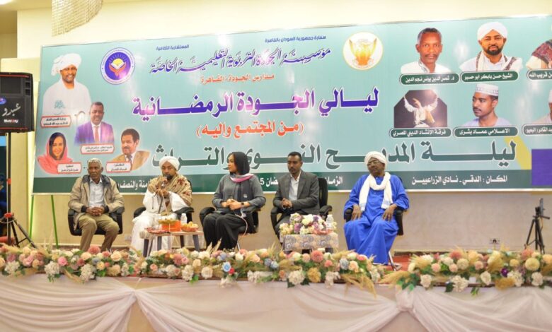 أنهت مؤسسة الجودة التربوية التعليمية السودانية بالقاهرة امسياتها الرمضانية امس بليلة المديح النبوي والتراث بمشاركة واسعة من منشديين للمديح النبوي ومتخصصين في التراث.