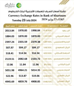 عبر نشرته اليومية نشر بنك الخرطوم أ اسعار الصرف_للعملات الاجنبية في بنك الخرطوم ليوم الثلاثاء، الموافق 23 يوليو 2024م. جاءت على النحو التالي