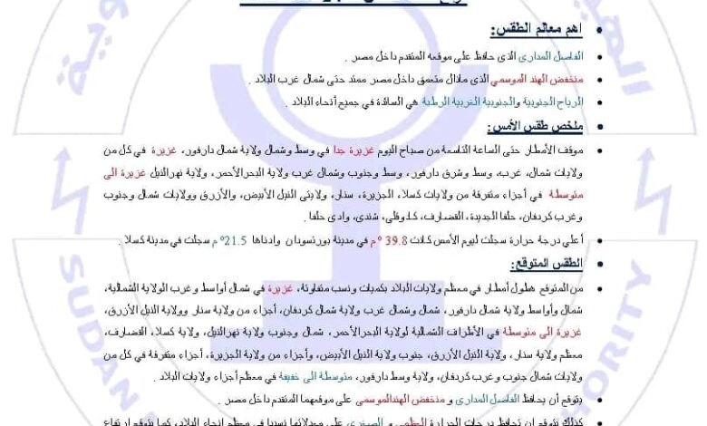 كما يتوقع ان تسجل مدينتي بورتسودان ووادي حلفا اعلى درجة حرارة اليوم وهي 42°م، فيما يتوقع لأدني درجة حرارة صباح الغد ١٩°م في مدينة كسلا