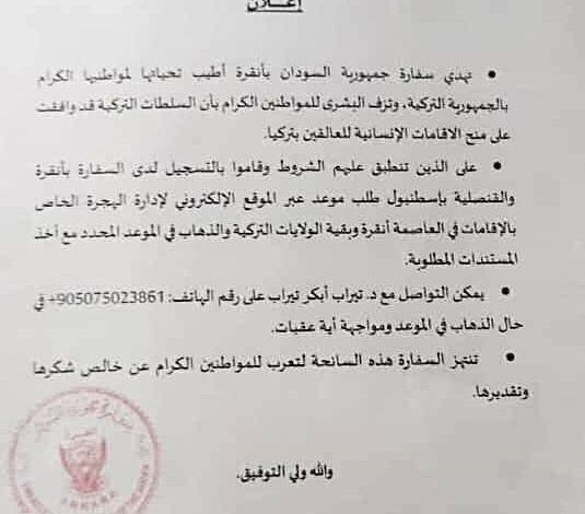 تُعلن سفارة جمهورية السودان بدولة تركيا للمواطنين السودانيين العالقين بتركيا موافقة الحكومة التركية على منح الإقامات الإنسانية للسودانيين العالقين ، وتنشر إعلان بالتفاصيل