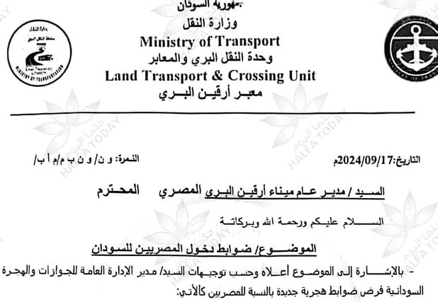 أعلنت وزارة النقل السودانية عن فرض ضوابط جديدة لدخول المواطنين المصريين إلى السودان عبر معبر أرقين البري. تأتي هذه الإجراءات استنادًا إلى توجيهات مدير الإدارة العامة للجوازات والهجرة في السودان، كما ورد في خطاب موجه إلى مدير المعبر.