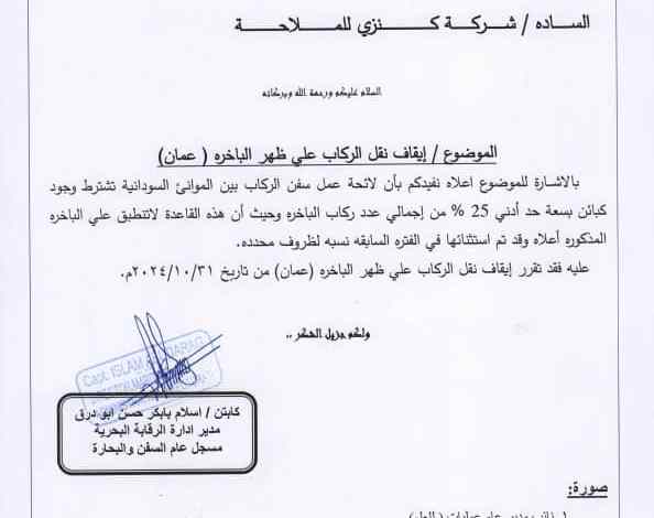 في قرار اسعد الشعب السودان خاصة المسافرين ما بين السودان و السعودية اصدرت وزارة النقل السودانية قرارا يقضي بوقف عمل الباخرة عمان التابعة لشركة كنزي للنقل البحري و العاملة في مجال نقل الركاب ما بين السودان و المملكة العربية السعودية ابتداء من نهاية الشهر الجاري. و ذلك لعدم توفر غرف نوم للركاب