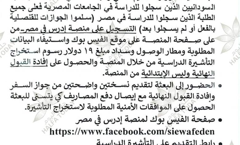 وقالت: إنه طبقاً لتعليمات وزارة التعليم العالي والبحث العلمي الخاصة بالطلاب السودانيين الذين سجلوا للدراسة في الجامعات المصرية .على جميع الطلبة الذين سجلوا للدراسة في مصر وسلموا الجوازات للقنصلية بالفعل أو لم يسجلوا بعد التسجيل على منصة إدرس في مصر – صفحة المنصة على موقع الفيس بوك واستيفاء البيانات المطلوبة، ومطار الوصول وسداد مبلغ 19 دولار رسوم استخراج التأشيرة الدراسية من خلال المنصة والحصول على إفادة القبول النهائية وليس الابتدائية.