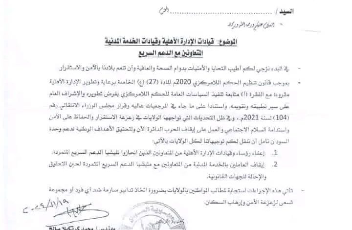 وجهت السلطات السودانية في بورتسودان من خلال مستند رسمي صادر عن وزارة الحكم الاتحادي ، حكام الأقاليم والولايات بضرورة إيقاف كل العاملين والموظفين في المؤسسات الحكومية المشتبه في تعاونهم مع ميليشيا الدعم السريع عن العمل فوراً إلى حين التحقيق معهم.