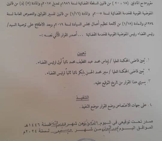 رئيس مجلس السيادة يصدر قرارا بتعيين نواب لرئيس القضاء