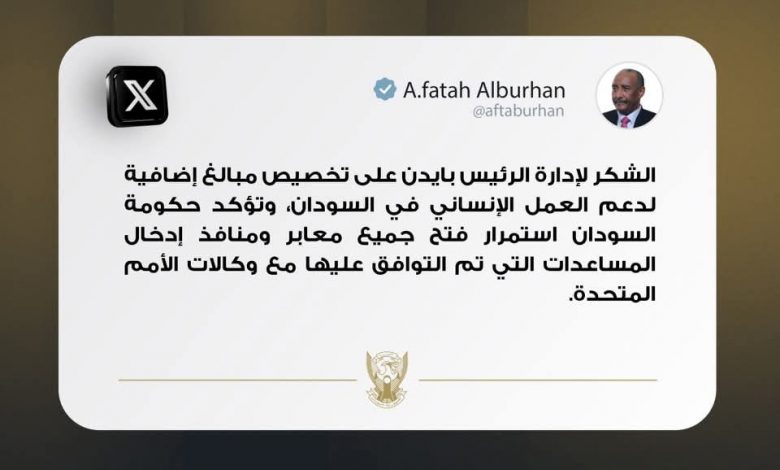 وقال في تغريدة على حسابه في منصة إكس، “الشكر لإدارة الرئيس بايدن على تخصيص مبالغ إضافية لدعم العمل الإنساني في السودان، وتؤكد حكومة السودان استمرار فتح جميع معابر ومنافذ إدخال المساعدات التي تم التوافق عليها مع وكالات الأمم المتحدة”.