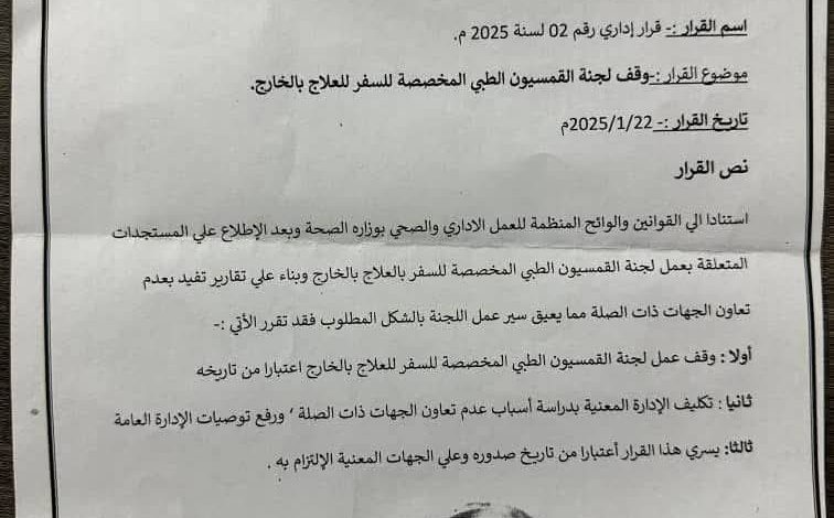 قررت لجنة القمسيون الطبي المخصصة للسفر للعلاج بالخارج بمستشفى وادي حلفا، إيقاف عملها اعتبارا من اليوم الأربعاء.