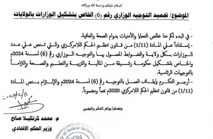 اصدر المهندس محمد كرتكيلا صالح وزير الحكم الاتحادي قرارا بتجميد التوجيه الوزاري رقم (6) الخاص بتشكيل ودمج الوزارات بالولايات ، وجاء القرار إستناداً علي المادة (1/11) من قانون تنظيم الحكم اللامركزي والتي تنص علي عدد الوزارات بكل ولاية والضوابط المعمول بها والتوجيه الوزاري رقم (6) لسنة 2024م والخاص بتشكيل حكومة رشيقة من المالية والتربية والتعليم والصحة والتزاماً بالتوجيهات الرئاسية. ووجه الوزير بإيقاف العمل بالتوجيه رقم (6) لسنة 2024م والإلتزام بنص المادة (1/11) من قانون تنظيم الحكم اللامركزي 2020م نصاً ومضموناً ..