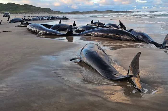 وأكدت هيئة المتنزهات والحياة البرية أن 175 حوتًا جنحت بصورة مفاجئة على الجزيرة في نهر آرثر، مشددين على أن فرص بقاء الكثير منها على قيد الحياة بسبب طبيعة الشاطئ النائية ضعيفة جدًا.