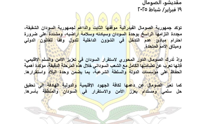 تؤكد جمهورية الصومال الفيدرالية موقفها الثابت والداعم لجمهورية السودان الشقيقة، مجددة التزامها الراسخ بوحدة السودان وسيادته وسلامة أراضيه، ومشددة على ضرورة احترام مبادئ عدم التدخل في الشؤون الداخلية للدول وفقاً للقانون الدولي وميثاق الأمم المتحدة.