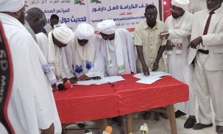وقع تحالف الكرامة لاهل دارفور الذي يضم ثمانية عشر كيانا ميثاق تحت شعار (معا لدعم القوات المسلحة ودحر التمرد وتقوية النسيج الاجتماعي) مؤكدين وقوفهم إلي جوار القيادة الحالية للدولة واستعدادهم بالدفع بالرجال والمال حتي تمام تحرير اخر شبر في البلاد من دنس التمرد .