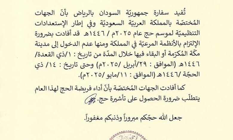 سفارة السودان بالرياض.. إعلان مهم بخصوص إجراءات الحج