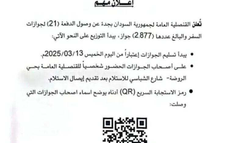 وأشارت القنصلية إلى أن عملية تسليم الجوازات ستبدأ اعتباراً من اليوم الخميس 13 مارس 2025، حيث دعت أصحاب الجوازات للحضور شخصياً إلى مقر القنصلية الكائن في حي الروضة – شارع الشباسي، لاستلام جوازاتهم بعد تقديم إيصال الاستلام.