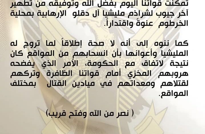قالت القوات المسلحة السودانية: تمكنت قواتنا اليوم بفضل الله وتوفيقه من تطهير آخر جيوب لشراذم مليشيا آل دقلو الإرهابية بمحلية الخرطوم عنوةً واقتداراً.