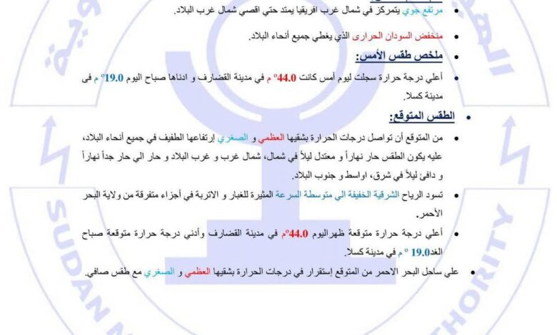 أعلى درجة حرارة متوقعة ظهر اليوم 44.0ºم في مدينة القضارف وأدنى درجة حرارة متوقعة صباح الغد19.0 º م في مدينة كسلا.