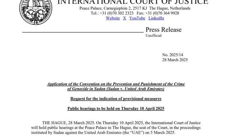 ستعقد محكمة العدل الدولية، يوم الخميس ١٠ أبريل ٢٠٢٥، جلسات استماع علنية في قصر السلام بلاهاي، مقر المحكمة، للنظر في الدعوى التي رفعها السودان ضد الإمارات العربية المتحدة (“الإمارات العربية المتحدة”) في ٥ مارس ٢٠٢٥.
