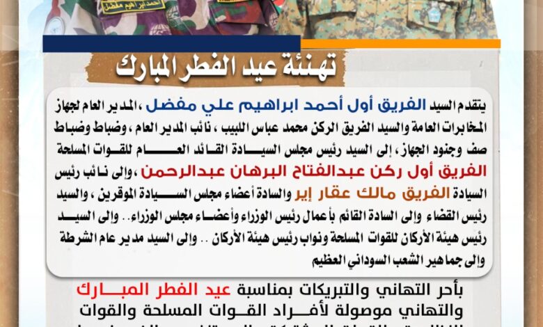 يتقدم السيد الفريق أول أحمد ابراهيم علي مفضل، المدير العام لجهاز المخابرات العامة، والسيد الفريق الركن محمد عباس اللبيب، نائب المدير العام، وضباط وضباط صف وجنود الجهاز، إلى السيد رئيس مجلس السيادة القائد العام للقوات المسلحة الفريق أول ركن عبدالفتاح البرهان عبدالرحمن، وإلى نائب رئيس السيادة الفريق مالك عقار إير، والسادة أعضاء مجلس السيادة الموقرين، والسيد رئيس القضاء .. وإلى السادة القائم بأعمال رئيس الوزراء وأعضاء مجلس الوزراء.. وإلى السيد رئيس هيئة الأركان للقوات المسلحة ونواب رئيس هيئة الأركان .. وإلى السيد مدير عام الشرطة .. وإلى جماهير الشعب السوداني العظيم، بأحر التهاني والتبريكات بمناسبة عيد الفطر المبارك، والتهاني موصولة لأفراد القوات المسلحة والقوات النظامية والقوات المشتركة والمستنفرين، الذين ضربوا أروع الأمثلة في التضحية والفداء من أجل الوطن حتى عادت، الخرطوم حرة أبية، خالية من الأوباش والمليشيا كما أخص منسوبي جهاز المخابرات العامة بتحية الفخر والإعتزاز لدورهم الوطني المشهود في الذود عن أمن الوطن واستقراره.