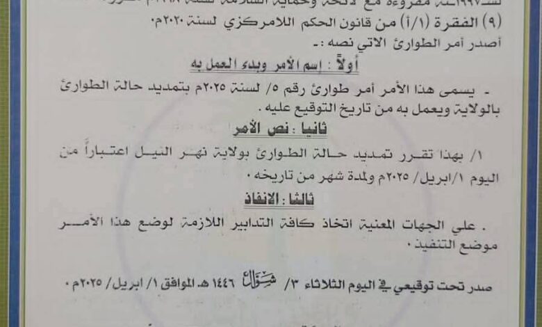 الأخبار تمديد حالة الطوارئ بولاية نهر النيل لمدة شهر يبدأ من ١/ابريل/٢٠٢٥ عزة برس2025-04-01تابعنا على الواتساب لمزيد من الاخبارعزة برس2025-04-01 فيسبوك X لينكدإن ماسنجر ماسنجر واتساب تيلقرام
