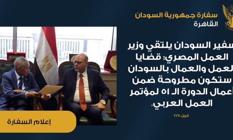 واستعرض السفير رؤية الدولة السودانية في ضرورة استفادة الشباب السوداني بالقاهرة من الخبرات المصرية، مؤكداً تطلع السفارة لرعاية معالي وزير العمل المصري لمبادرة تستهدف تنشيط التعاون في مجال التدريب المهني.