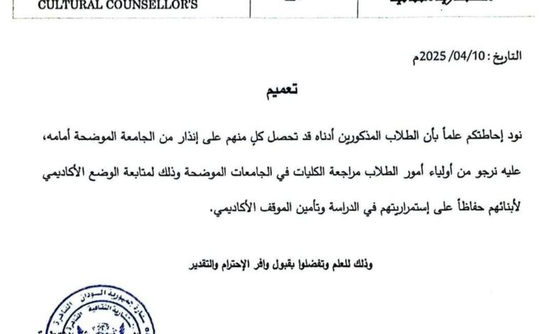 نود إحاطتكم علماً بأن الطلاب المذكورين أدناه قد تحصل كل منهم على إنذار من الجامعة الموضحة أمامه، عليه نرجو من أولياء أمور الطلاب مراجعة الكليات في الجامعات الموضحة وذلك لمتابعة الوضع الأكاديمي لأبنائهم حفاظاً على استمراريتهم في الدراسة وتأمين الموقف الأكاديمي.