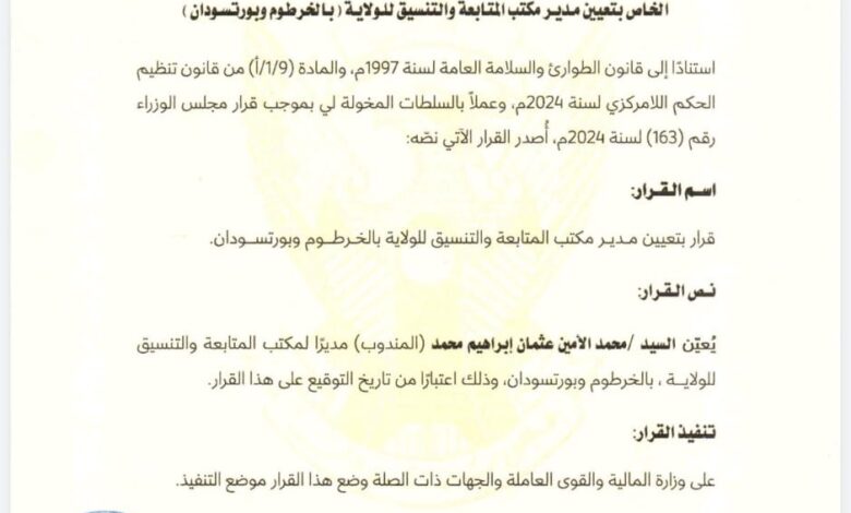 عهد والي وسط دارفور مصطفى نصر الدين أحمد تمبور منصب مدير مكتب المتابعة بولايتي الخرطوم بورتسودان للأستاذ محمد الأمين عثمان إبراهيم محمد