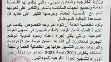 القنصلية العامة للسودان في بنغازي تعلن إعفاء السودانيين المغادرين من رسوم تسوية الوضع الهجري