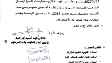 تعميم بشأن إنهاء فترة الاجازة المفتوحة للعاملين بولاية الخرطوم