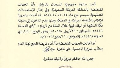 سفارة السودان بالرياض.. إعلان مهم بخصوص إجراءات الحج