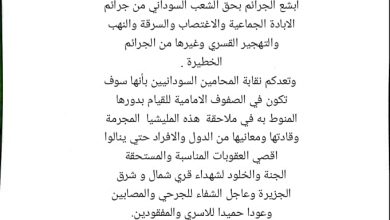 نقابة المحامين السودانيين المنتخبة.. بيان حول مجزرة قري شمال و شرق الجزيرة