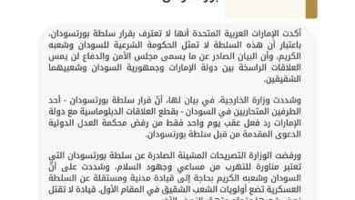 الإمارات : نرفض التصريحات المؤسفة.. الصادرة عن مجلس الأمن والدفاع السوداني.. بيان