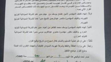 الطاقة والنفط تطيح مدير عام الشركة السودانية لتوزيع الكهرباء مدير عام الشركة السودانية للتوليد الحراري وتكلف آخرين